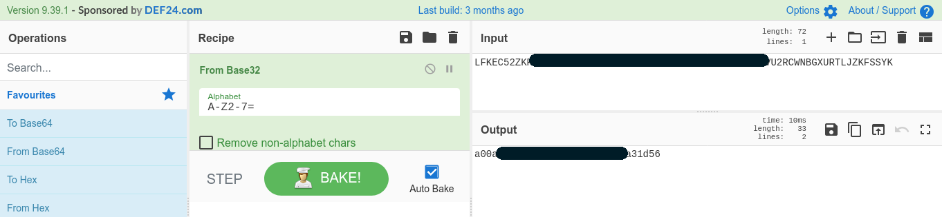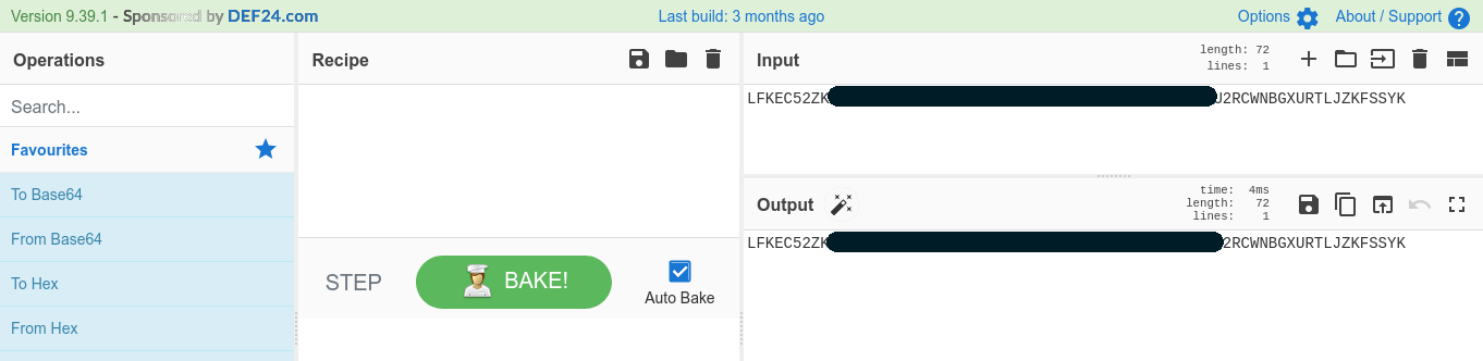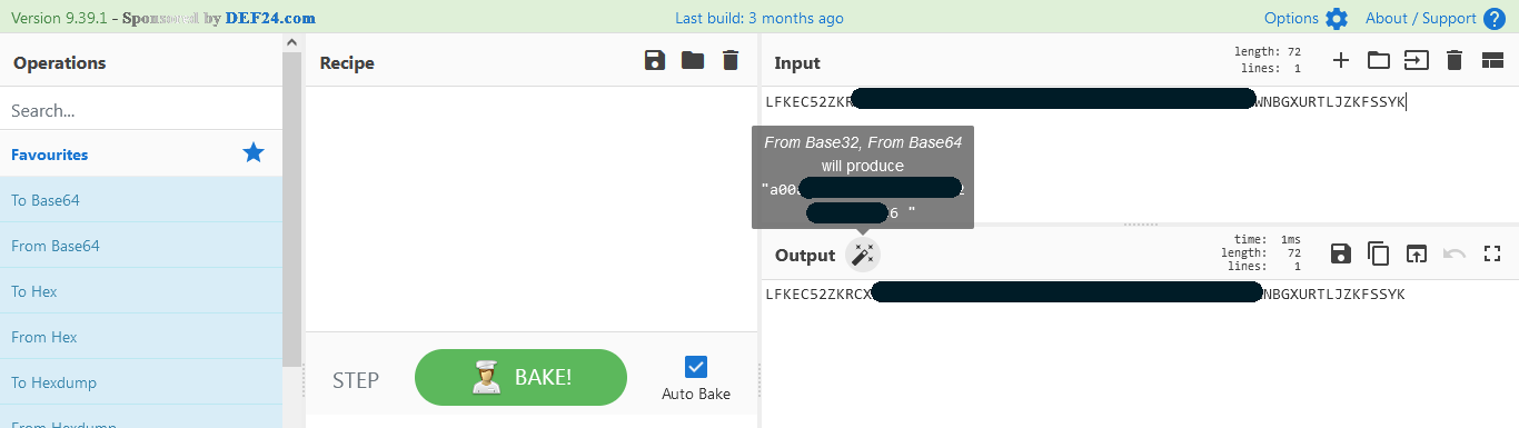 OK. Con la operación anterior hemos obtenido una cadena que no sabemos muy bien qué es. Tiramos del servicio online Cyberchef para que nos eche una mano.